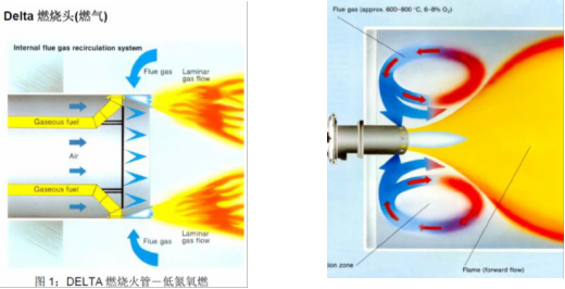 燃烧头采用了 DELTA 燃烧头技术,其独特的设计使空气和 燃气达到最优配比,有效的降低了氮氧化物的排放,为了实现更低的 NOx 排放,机器自带烟气外部 再循环控制系统。